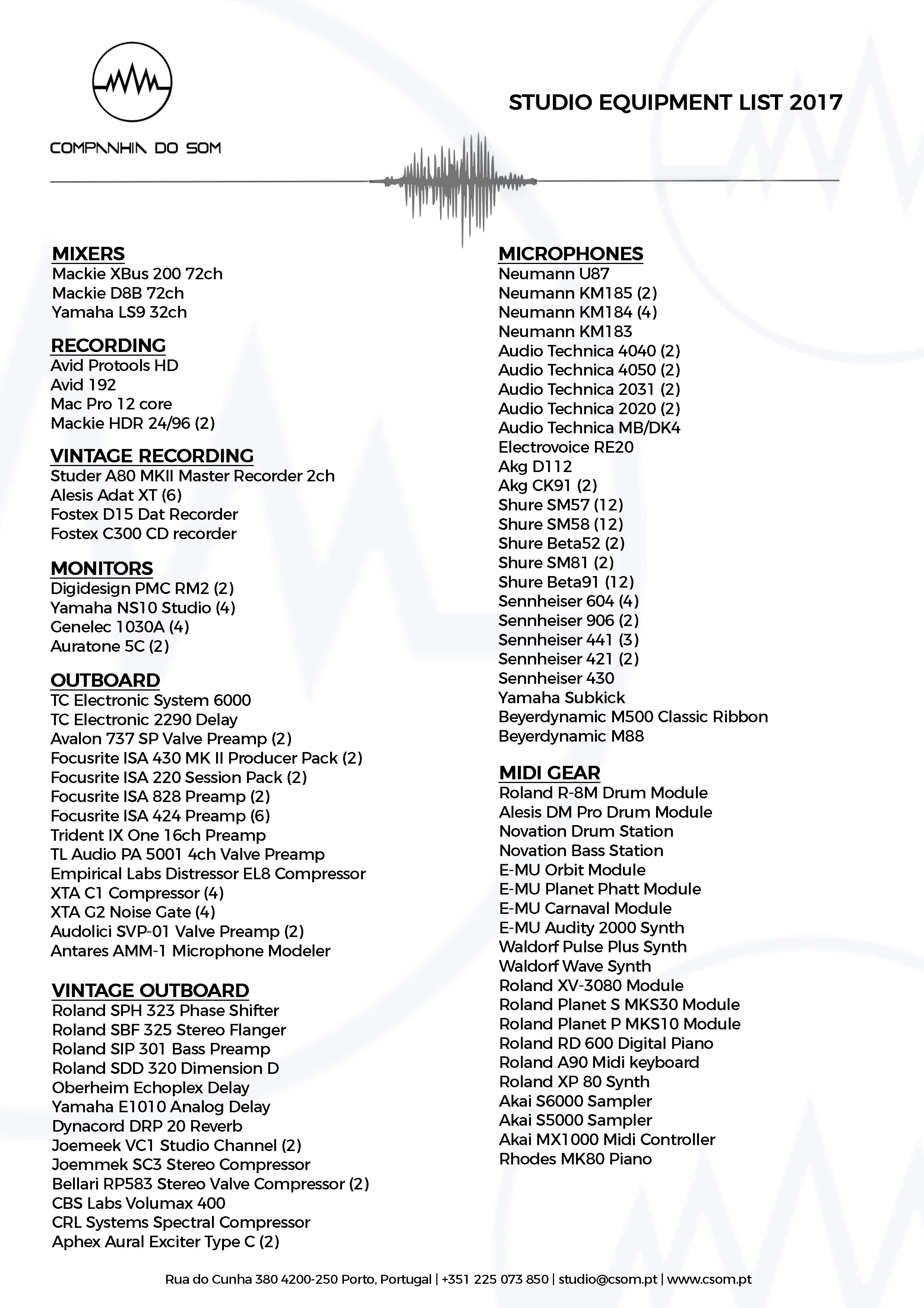 Dispomos de uma extensa lista de equipamentos disponíveis para aluguer em constante actualização. Dos equipamentos Vintage aos mais actuais, encontrará a solução que precisa na Companhia do Som. Todos os nossos equipamentos são disponibilizados em caixas de transporte com os respectivos cabos e acessórios.
